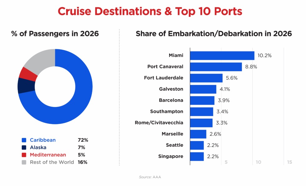 The Caribbean accounts for 72 percent of U.S. cruise embarkations. Miami, Port Canaveral and Fort Lauderdale—among the world’s busiest cruise ports—experience peak activity from November through March. Summer family travel drives higher fares despite a reduced ship count between June and August.